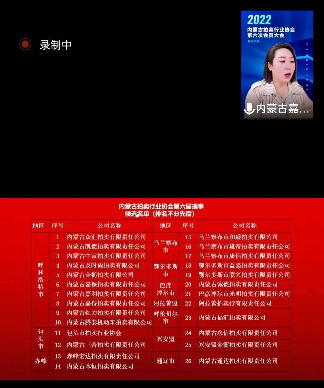 開拓進(jìn)取,銳意創(chuàng)新 內(nèi)蒙古拍賣行業(yè)協(xié)會第六次會員大會暨六屆一次理事會 勝利閉幕 2022年6月8日,內(nèi)蒙古拍賣行業(yè)協(xié)會第六次會員大會暨六屆一次理事會在內(nèi)蒙古拍賣行業(yè)協(xié)會會議室及線上騰訊會議室同步召開。全區(qū)有57家會員單位代表出席了會議。會議由第五屆副會長蘆真主持。 特別鳴謝來自中拍協(xié)、北京拍協(xié)、上海拍協(xié)、廣東拍協(xié)、天津拍協(xié)、河北拍協(xié)、湖北拍協(xié)、湖南拍協(xié)、吉林拍協(xié)、江西拍協(xié)、寧夏拍協(xié)、青海拍協(xié)、山西拍協(xié)、陜西拍協(xié)、云南拍協(xié)、浙江拍協(xié)、重慶拍協(xié)、黑龍江拍協(xié)等兄弟省市協(xié)會發(fā)來的賀信與賀電。 根據(jù)會議議程,大會審議通過了《內(nèi)蒙古拍賣行業(yè)協(xié)會第五屆理事會工作報(bào)告》、《內(nèi)蒙古拍賣行業(yè)協(xié)會第五屆理事會財(cái)務(wù)報(bào)告》;第五屆理事會會長王志江為到達(dá)現(xiàn)場的企業(yè)代表頒發(fā)了抗疫期間愛心企業(yè)捐贈證書和企業(yè)信用等級評級證書,同時(shí)會議以線上無記名投票的方式選舉產(chǎn)生了第六屆理事會理事單位26家。 在第六次會員大會結(jié)束后,新任理事召開了六屆一次理事會,理事會由協(xié)會副會長蘆真主持。 理事會中,以線上無記名投票的方式,選舉產(chǎn)生了新一屆協(xié)會負(fù)責(zé)人,趙軍同志任會長,娜晴同志任秘書長,同時(shí)選舉產(chǎn)生了14位副會長,分別是:王志江、賈世軍、王罡、王文賢、蘆真、郭素英、裴學(xué)文、王峰、林樹增、閆建兵、李曉玲、劉劍、蘇智慧、馬文平。六屆一次理事會還審議通過了新一屆的《會長辦公會議事規(guī)則》,討論了協(xié)會下半年的工作計(jì)劃及方向。 最后,新任會長趙軍做了總結(jié)講話,趙會長表示:這幾年來,我區(qū)拍賣業(yè)持續(xù)快速增長,取得了長足發(fā)展,相信在未來五年內(nèi)一定能夠取得更大的成就,對我區(qū)行業(yè)發(fā)展產(chǎn)生更加深遠(yuǎn)影響。我們新一屆的領(lǐng)導(dǎo)班子也將全心全意為企業(yè)服務(wù),幫助企業(yè)解決問題,維護(hù)會員單位的合法權(quán)益,規(guī)范職業(yè)操守,直面疫情時(shí)代的機(jī)遇與挑戰(zhàn),按照高質(zhì)量發(fā)展的要求,一步一個(gè)腳印,團(tuán)結(jié)奮斗,促進(jìn)我區(qū)拍賣業(yè)的全面發(fā)展,相信我區(qū)拍賣業(yè)在未來的五年時(shí)間會邁上一個(gè)新的臺階,再創(chuàng)輝煌。