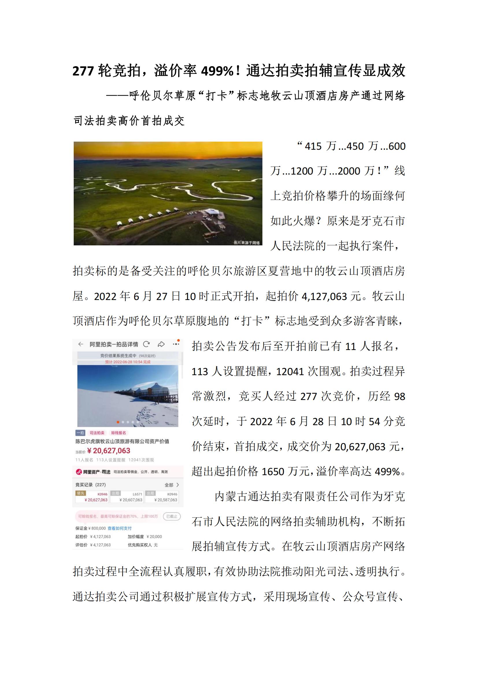 專(zhuān)業(yè)拍賣(mài)機(jī)構(gòu),助力司法拍賣(mài) 我區(qū)拍賣(mài)企業(yè)開(kāi)始入圍法院司輔機(jī)構(gòu)已經(jīng)兩年有余,在入圍的這兩年多時(shí)間里,拍賣(mài)企業(yè)作為專(zhuān)業(yè)的拍賣(mài)機(jī)構(gòu)不斷的完善自身,利用我們的專(zhuān)業(yè)助力司法拍賣(mài),提高司法拍賣(mài)的成交額。拍賣(mài)企業(yè)的專(zhuān)業(yè)就是拍賣(mài),作為司法輔助機(jī)構(gòu),我們拍賣(mài)企業(yè)更能夠從委托方角度出發(fā),從標(biāo)的角度出發(fā),從競(jìng)買(mǎi)人的角度出發(fā),深刻的了解各方的切實(shí)需求。也更可以找到標(biāo)的的亮點(diǎn)從而非常專(zhuān)業(yè)的對(duì)其進(jìn)行宣傳,通過(guò)拍賣(mài)企業(yè)本身的客戶資源以及通過(guò)網(wǎng)站、公眾號(hào)、宣傳視頻等多種新的宣傳自媒體齊發(fā)力,已經(jīng)突破了地域限制,使得更多的潛在買(mǎi)家可以看到和了解標(biāo)的。同時(shí)專(zhuān)業(yè)的拍賣(mài)公司有著強(qiáng)大的拍賣(mài)實(shí)力和風(fēng)控能力,對(duì)于拍賣(mài)過(guò)程中出現(xiàn)的問(wèn)題以及未出現(xiàn)的問(wèn)題都會(huì)做到提前準(zhǔn)備預(yù)案,這樣為標(biāo)的的最后成交奠定了專(zhuān)業(yè)而扎實(shí)的基礎(chǔ)。因?yàn)樾g(shù)業(yè)有專(zhuān)攻,讓專(zhuān)業(yè)的人做專(zhuān)業(yè)的事更能讓他們發(fā)揮所長(zhǎng),讓價(jià)值得到最大化,也能盡快的找到解決辦法,從而節(jié)省成本。 昨天收到來(lái)自?xún)?nèi)蒙古通達(dá)拍賣(mài)有限責(zé)任公司的好消息,位于呼倫貝爾草原“打卡”標(biāo)志地的“牧云山頂酒店”房產(chǎn)網(wǎng)絡(luò)司法拍賣(mài)通過(guò)該企業(yè)的輔助宣傳,網(wǎng)絡(luò)拍賣(mài)產(chǎn)生了激烈的競(jìng)價(jià),經(jīng)過(guò)277 輪競(jìng)價(jià)后,最終以 20,627,063 元成交,溢價(jià)率達(dá)到 499%。 這便是一個(gè)很好的例子,希望我們?nèi)珔^(qū)的拍賣(mài)企業(yè)都能充分發(fā)揮自身專(zhuān)業(yè)優(yōu)勢(shì),助力司法拍賣(mài),在這一領(lǐng)域開(kāi)疆?dāng)U土,以此為契機(jī),從點(diǎn)到線再到面的全面發(fā)展。